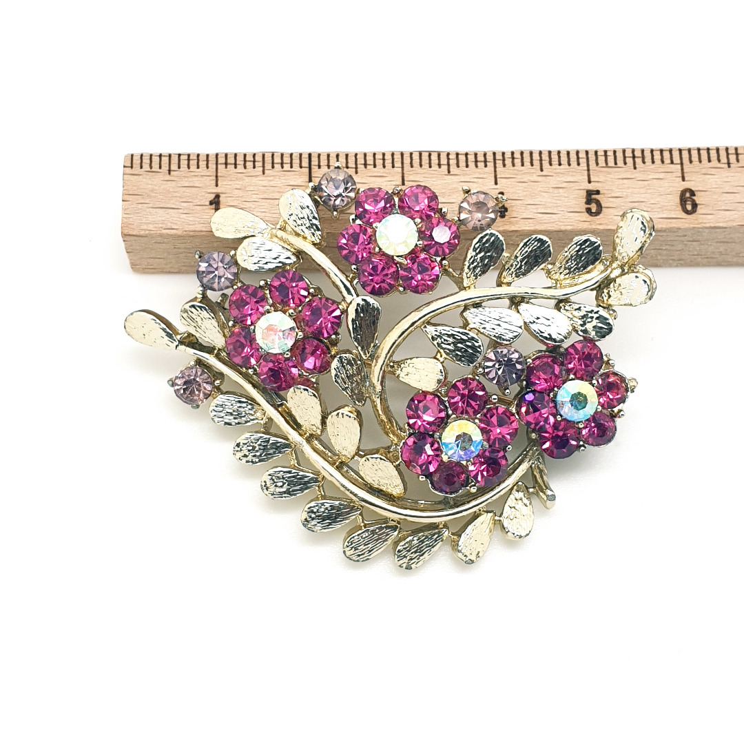 Lovely flower brooch with light goldtone brushed leaves and flowers with 'Schiaparelli'-pink rhinestones. In the middel of each flower you see a aurora borealis rhinestone and several light purple rhinestones between the leaves. It is in very good vintage condition with a darker spot on the back around one end of the brooch, near and around the end of the closure.. A really cool brooch.