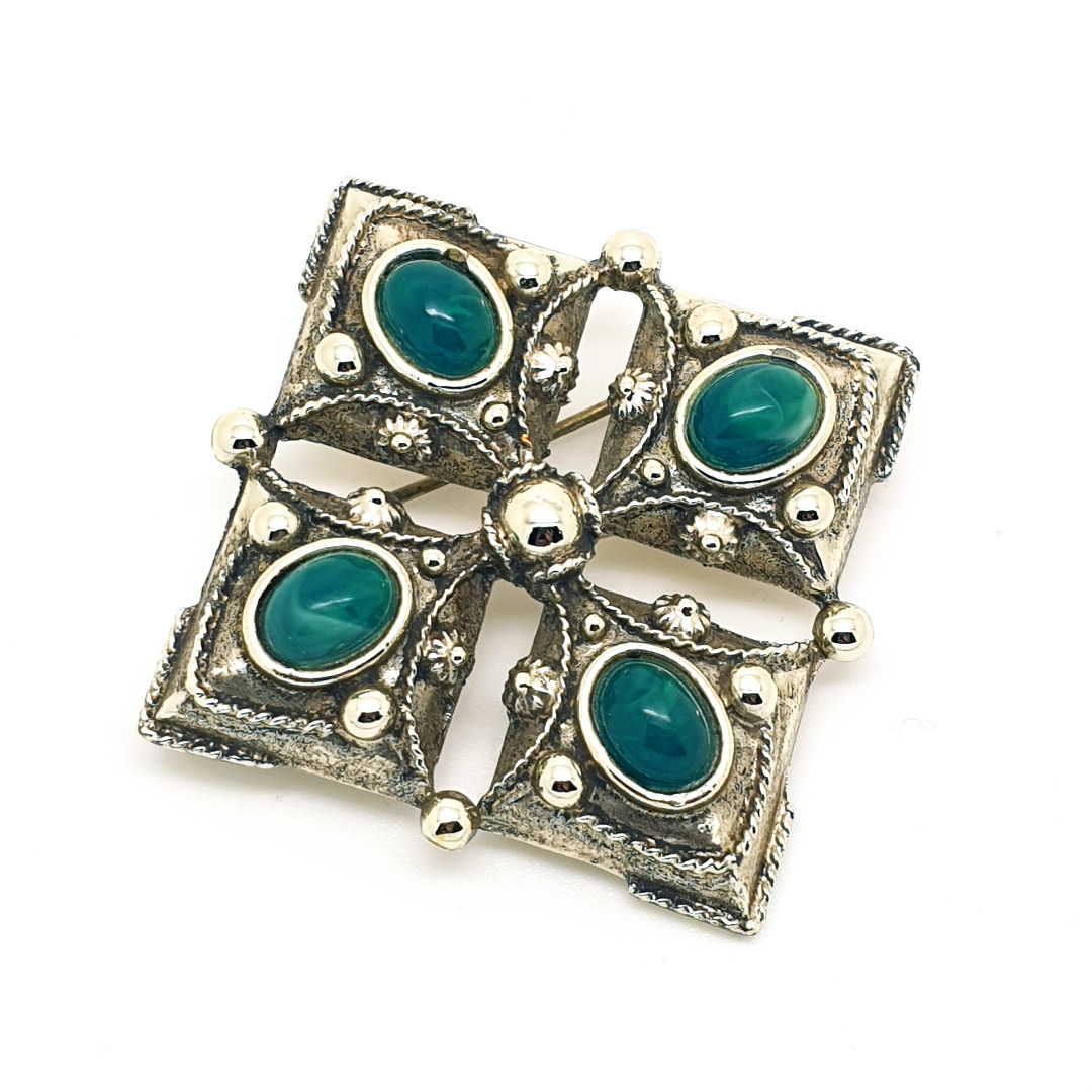 Square silvertone brooch with green cabochons with 'malachite look' by Jewelcraft, the English division of Coro. In very good vintage condition.