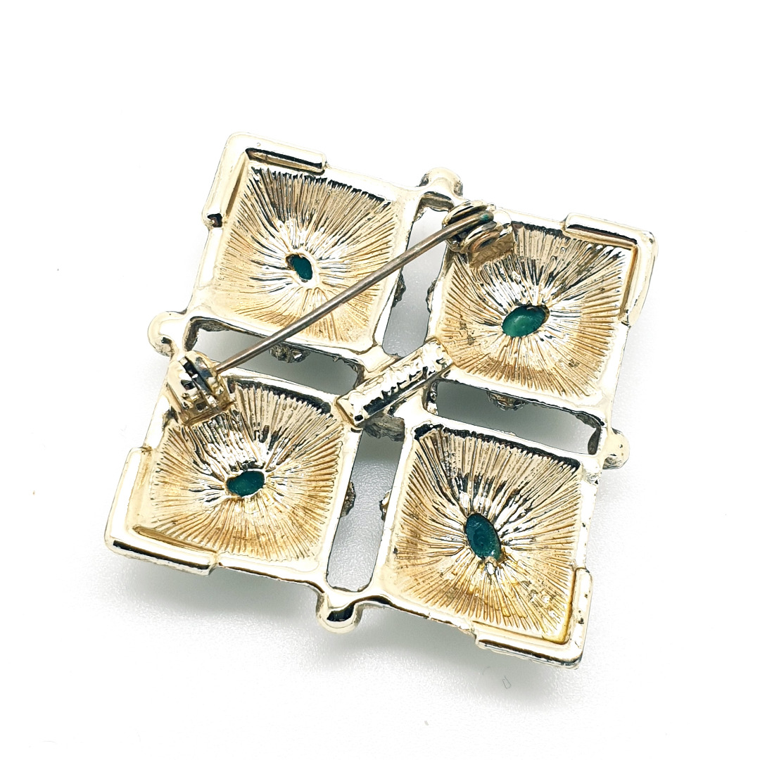 Zilverkleurige, vierkante broche met groene, ovale cabochons van Jewelcraft, de Engelse afdeling van Coro. De plastic cabochons hebben een malachiet-look.