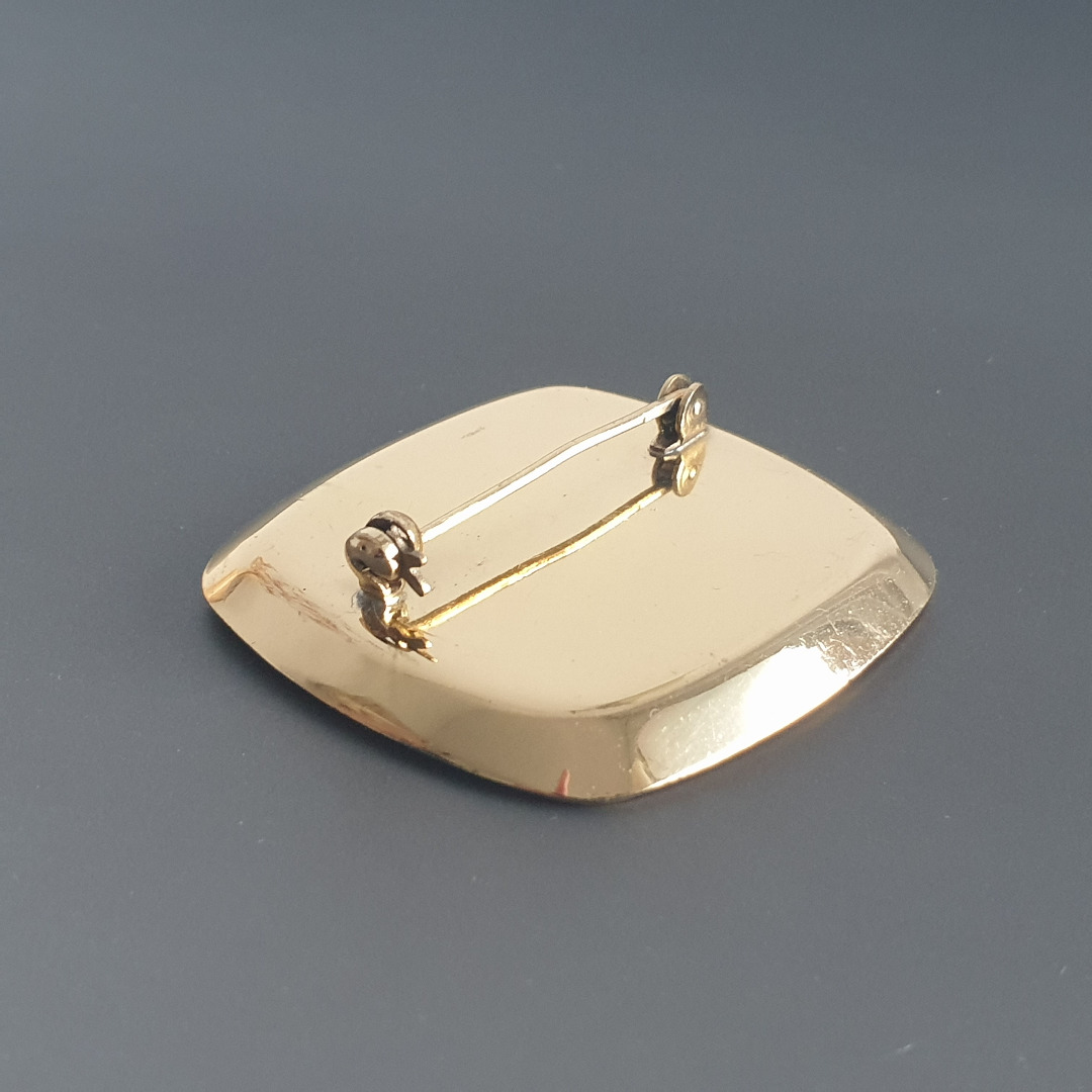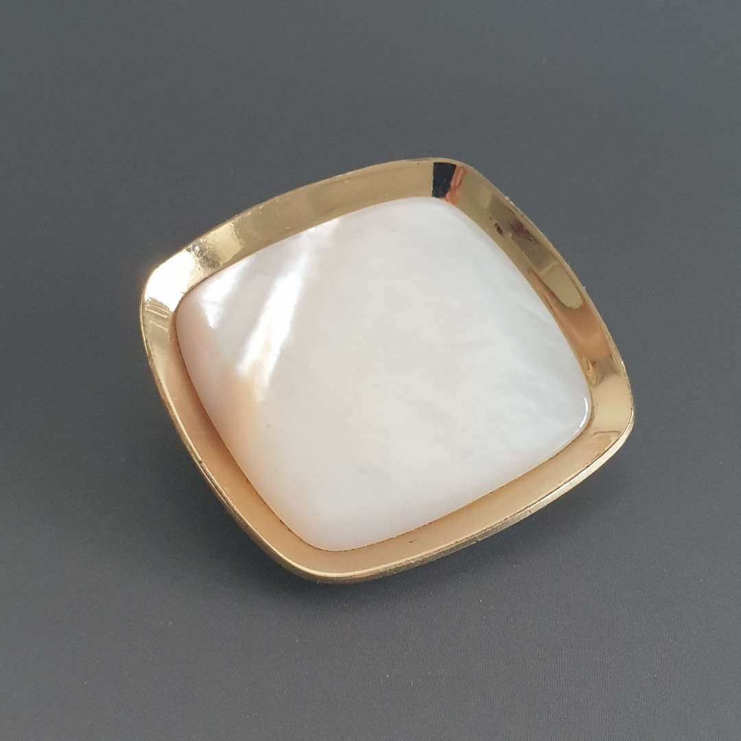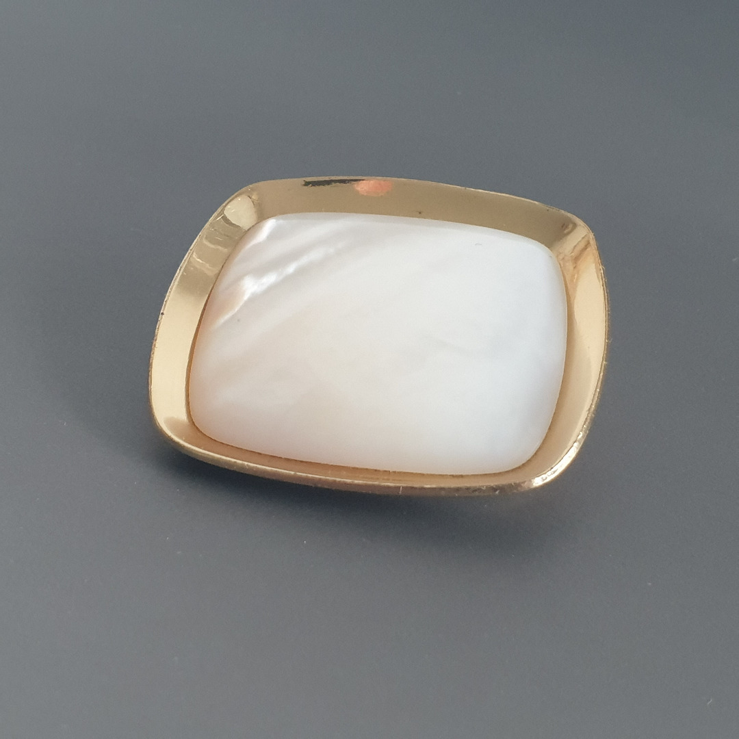 Vierkante goudkleurige broche met parelmoer. Een eenvoudige, klassieke broche. Prachtig te combineren met een paar soortgelijke manchetknopen of boordknoopjes.
