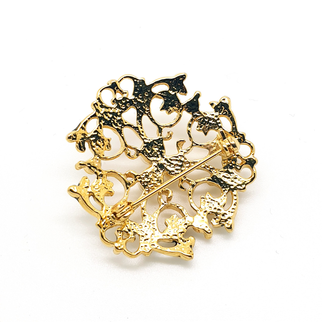 Ronde, goudkleurige broche met faux pareltjes. Her en der zie je wat nauwelijks opvallende kleine stukjes zwart email die het uiterlijk net even iets anders maken. Doet een beetje denken aan de Spaanse Damascene-broches.