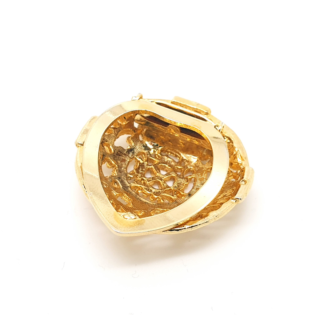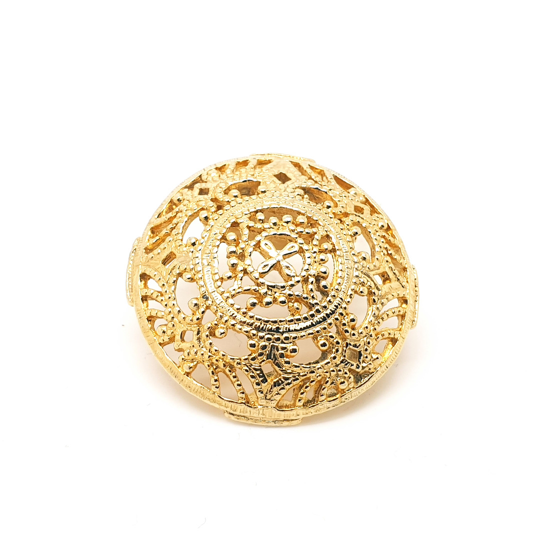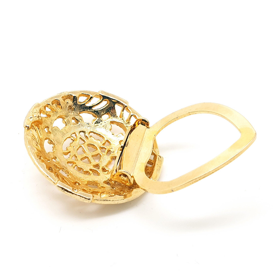 Mooie, ronde, goudkleurige opengewerkte sjaalclip. Een sieraad dat helaas in de loop de tijd in onbruik is geraakt. Tijd voor een 'sjaalclip-herleving'!