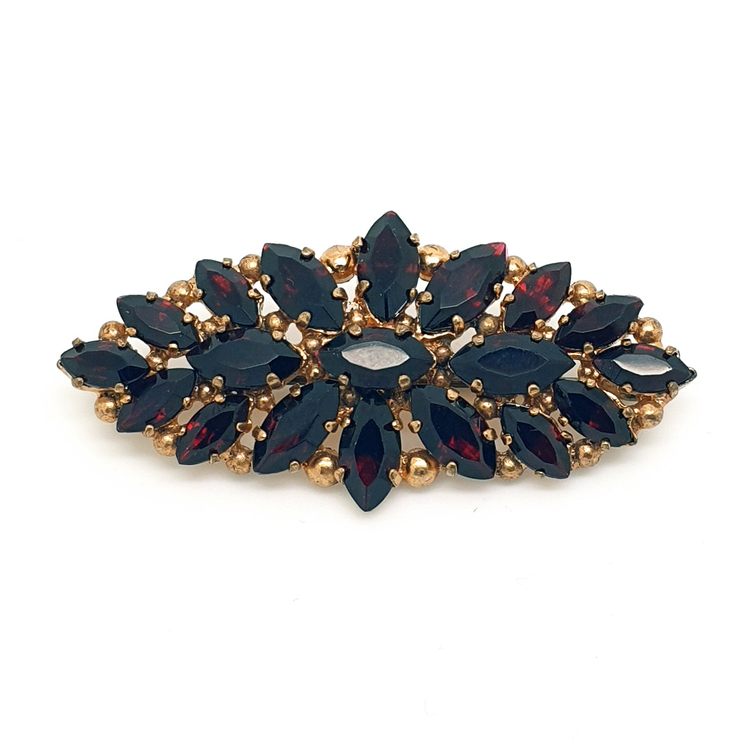 Classic brooch with dark garnet red navette shaped rhinestones. The rhinestones appear really dark, almost towards black until the light falls on them. In good to very good vintage condition.