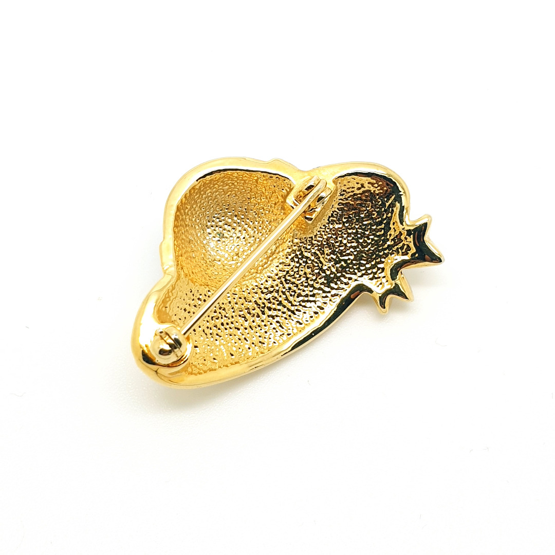 Snoezige, kleine, goudkleurige hoedjesbroche met blauw email en heldere strass.