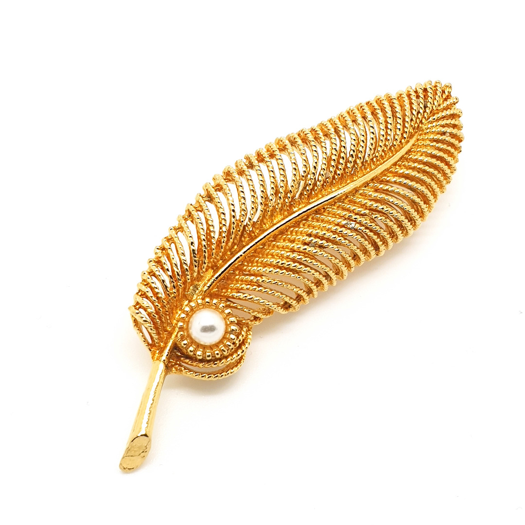 Goudkleurige opengewerkte bladbroche met 'faux' parel.