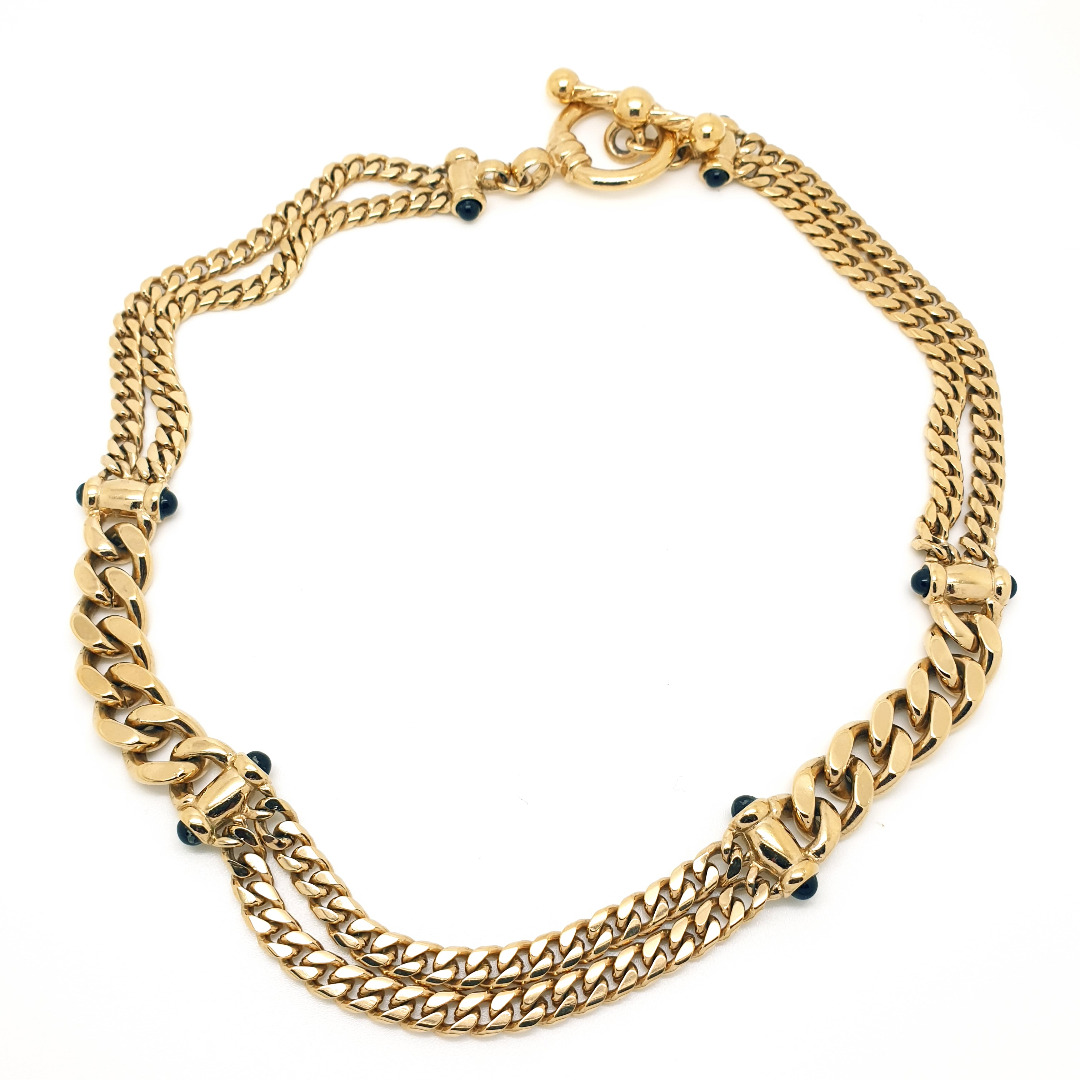 Korte, goudkleurige dubbele schakelketting met zwarte cabochons en T-sluiting van waarschijnlijk de jaren '90. Gezien de kwaliteit verwacht je gewoon een merkje te vinden, maar helaas! Waarschijnlijk een ontwerp van een kwaliteitsmerk als Cabouchon