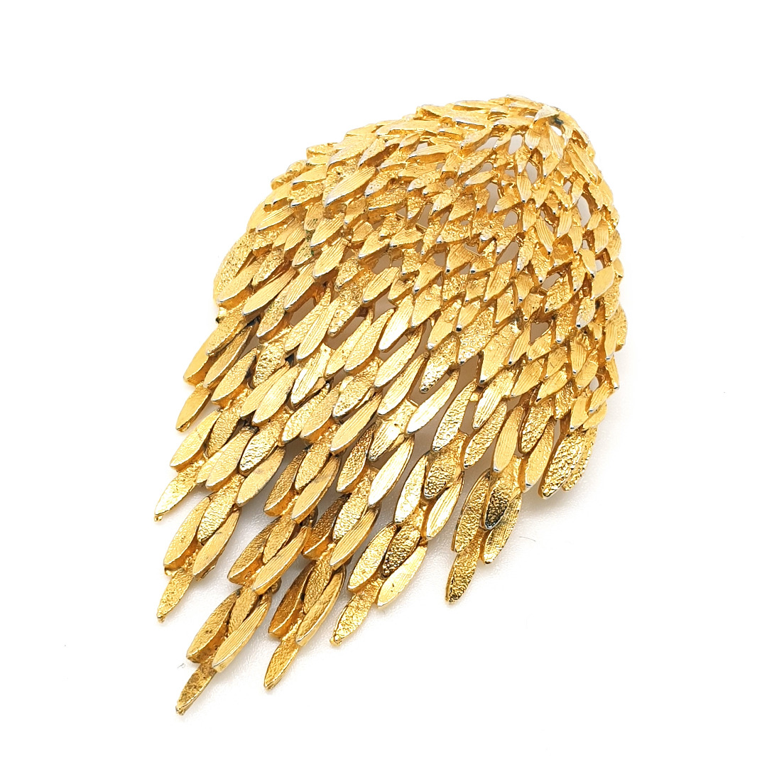 Goudkleurige bewerkte 'dangle' broche, oftewel bungelbroche.