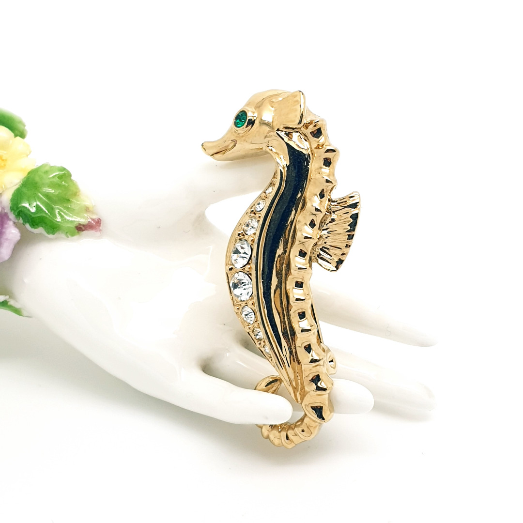 Snoezige, kleine goudkleurige broche van een zeepaardje met heldere strass en groen strassoogje.