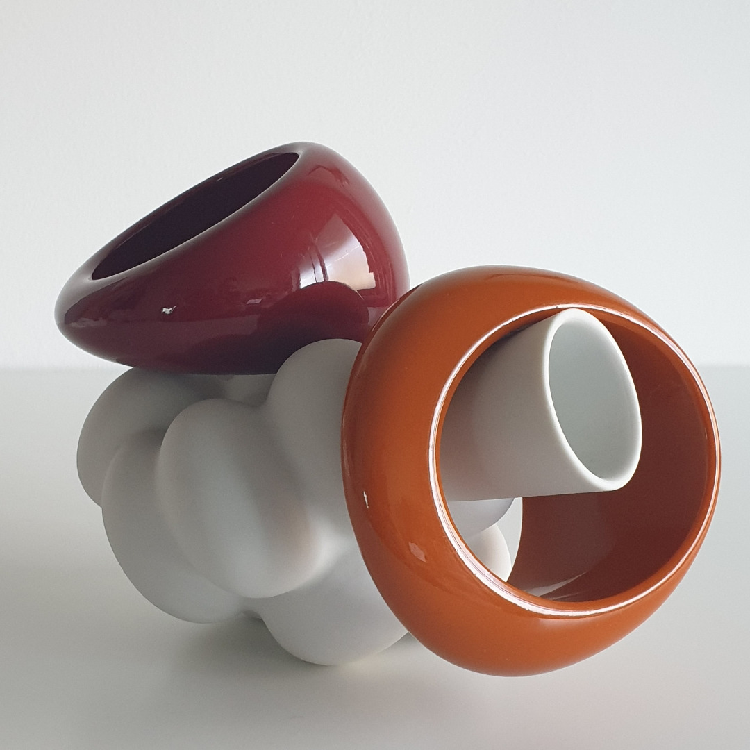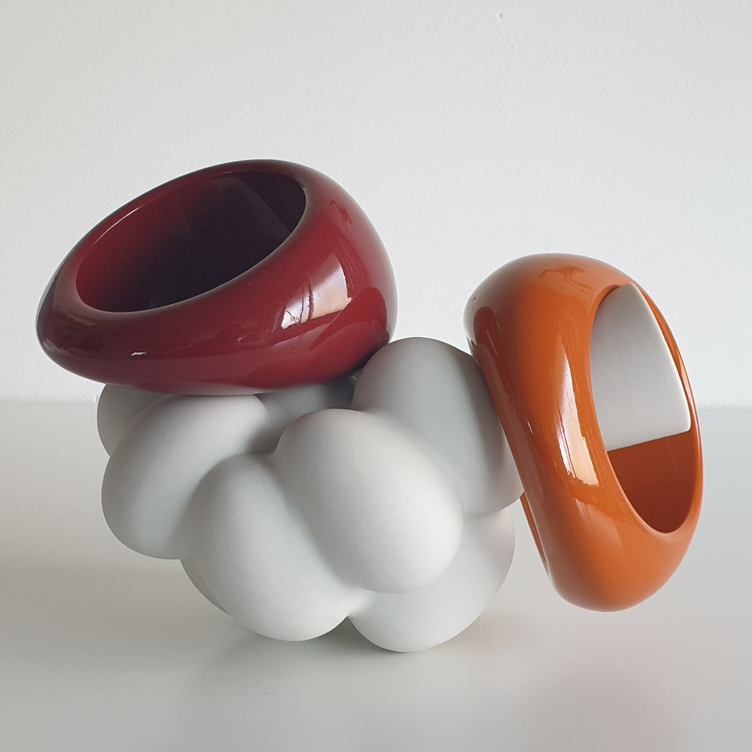 Massive, big, bold, beautiful and also heavy plastic bangles with the 70s-vibe. Two bangles available. One in orange-brown/camel colour and the other one in a lovely bordeaux red colour. Condition is good with the bordeaux coloured bangle having a slightly less condition then the camel coloured one. Hence the difference in price.