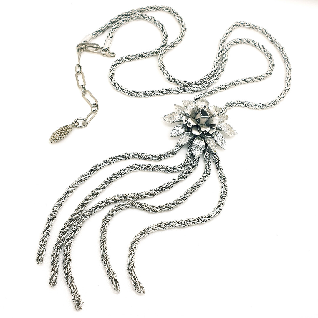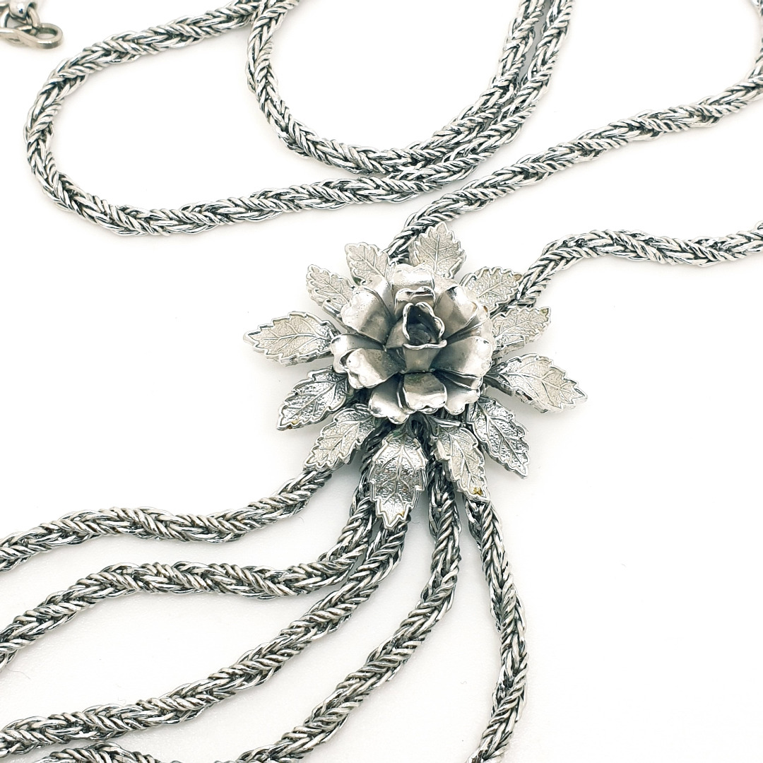 Lange zilverkleurige, bewerkte ketting, onderaan bij elkaar gehouden door een bloem. De ketting heeft een haaksluiting en een verlengkettinkje met hangtag. Het is géén sliderketting,