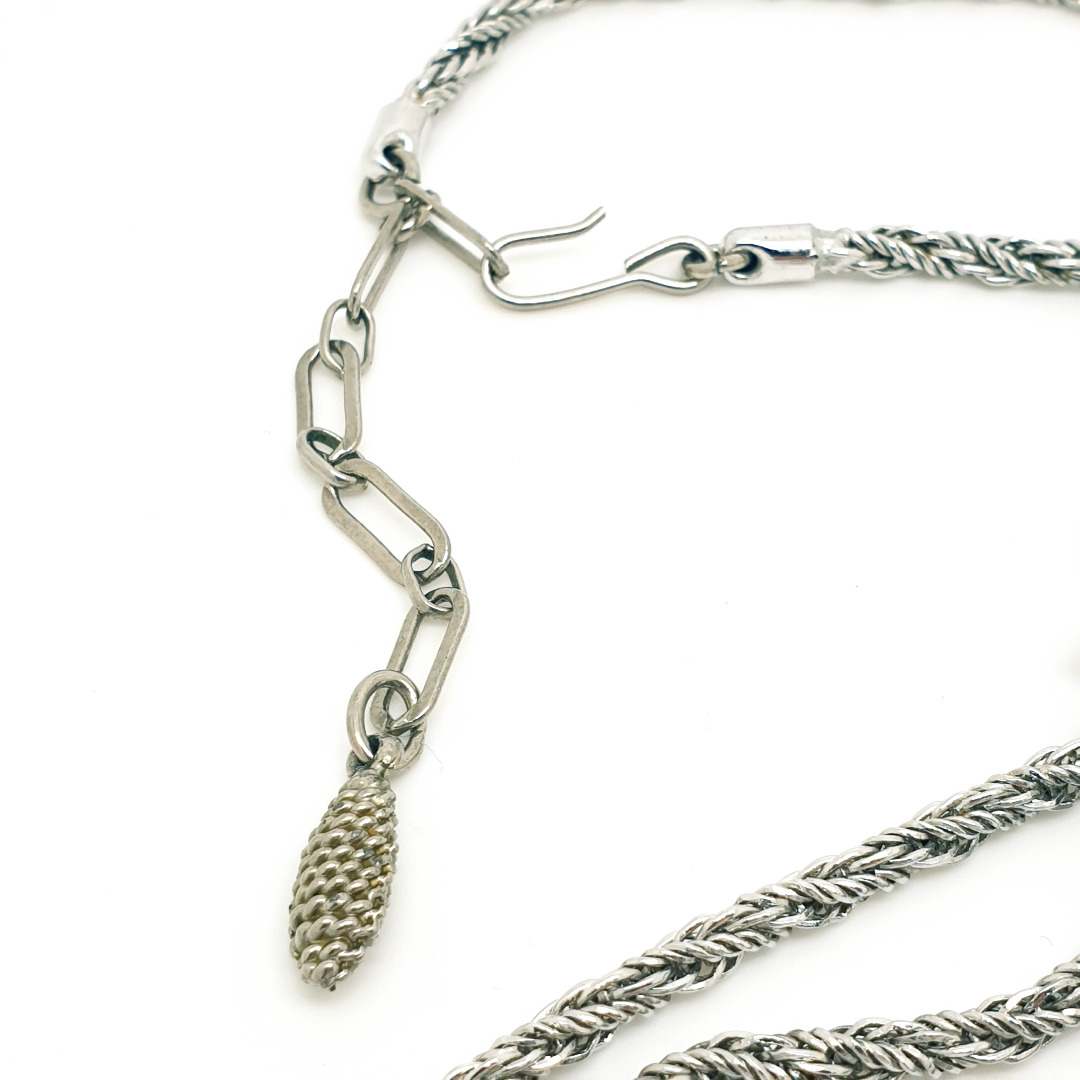 Long silvertone necklace with turned chain, flower, dangles, an extension chain and hook closure. Not a slider necklace. In very good vintage condition.
