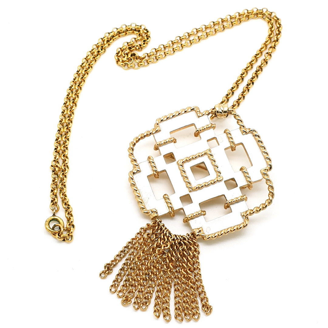 Goudkleurige ketting met opvallende goudkleurige, wit geëmailleerde hanger/broche combinatie van Avon. Goud met wit emaille is typisch voor ontwerpen uit de jaren '70. Zo ook bij bijvoorbeeld Trifari en Monet. Deze ketting dateert van 1972.