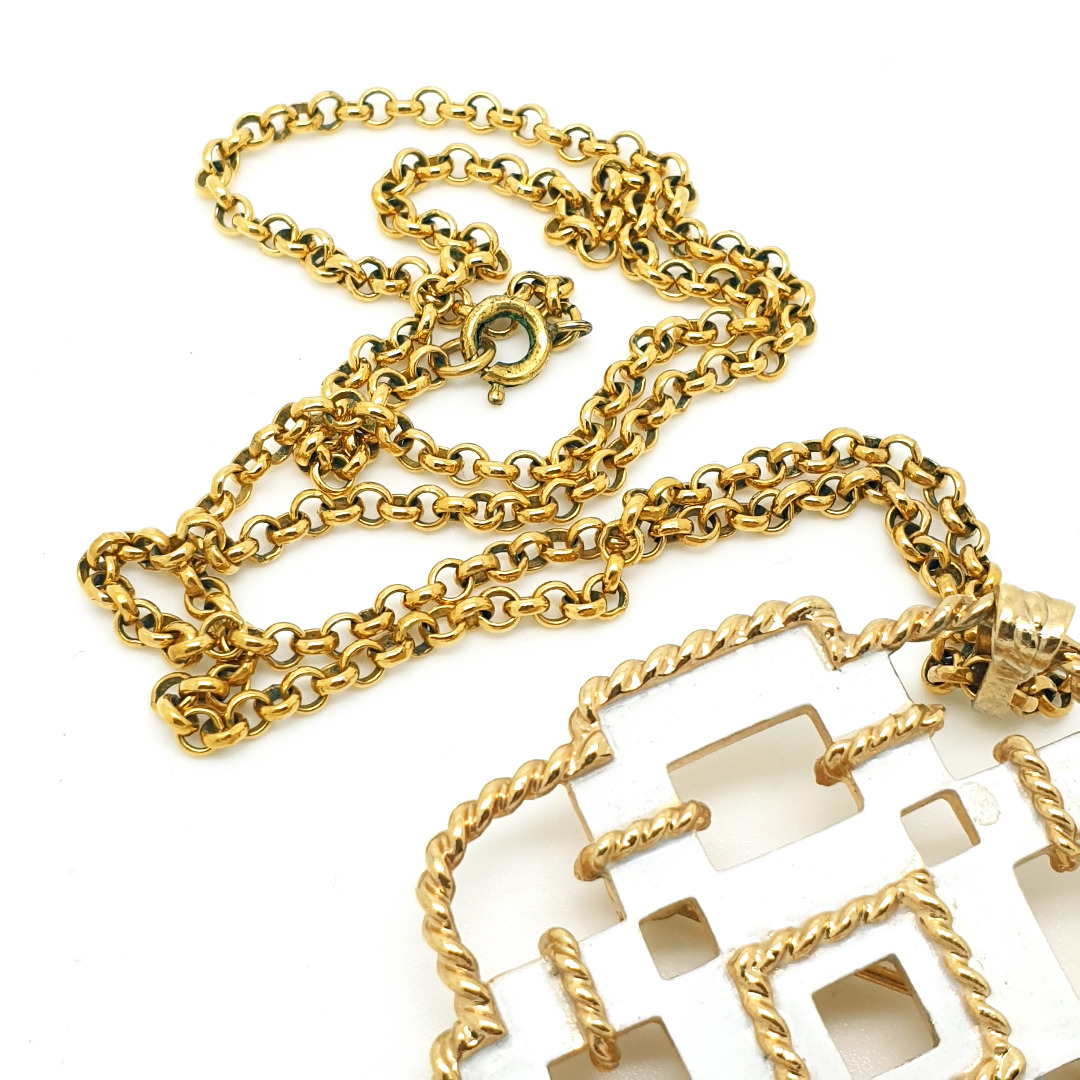 Goldtone necklace with goldtone, white enamelled pendant/brooch combination. So the pendant can on its own also be worn as a brooch. The gold and white enamel was a typical 70s combination. This necklace dates from 1972. In very good vintage condition.