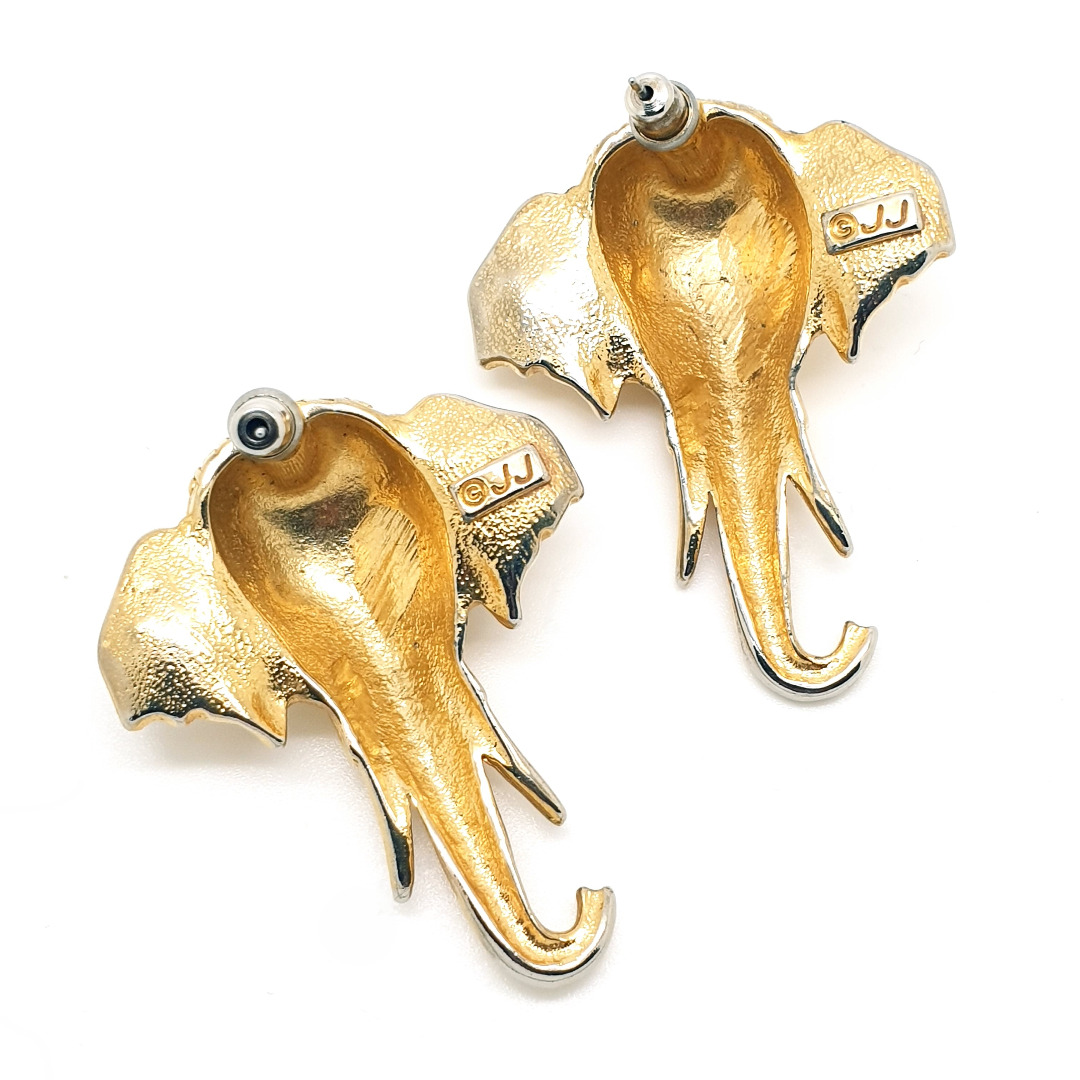 Heavy goldtone elephant head earrings by JJ, Jonette Jewelry. Fun, heavy earrings with in some places a light loss of goldtone, So good vintage condition.