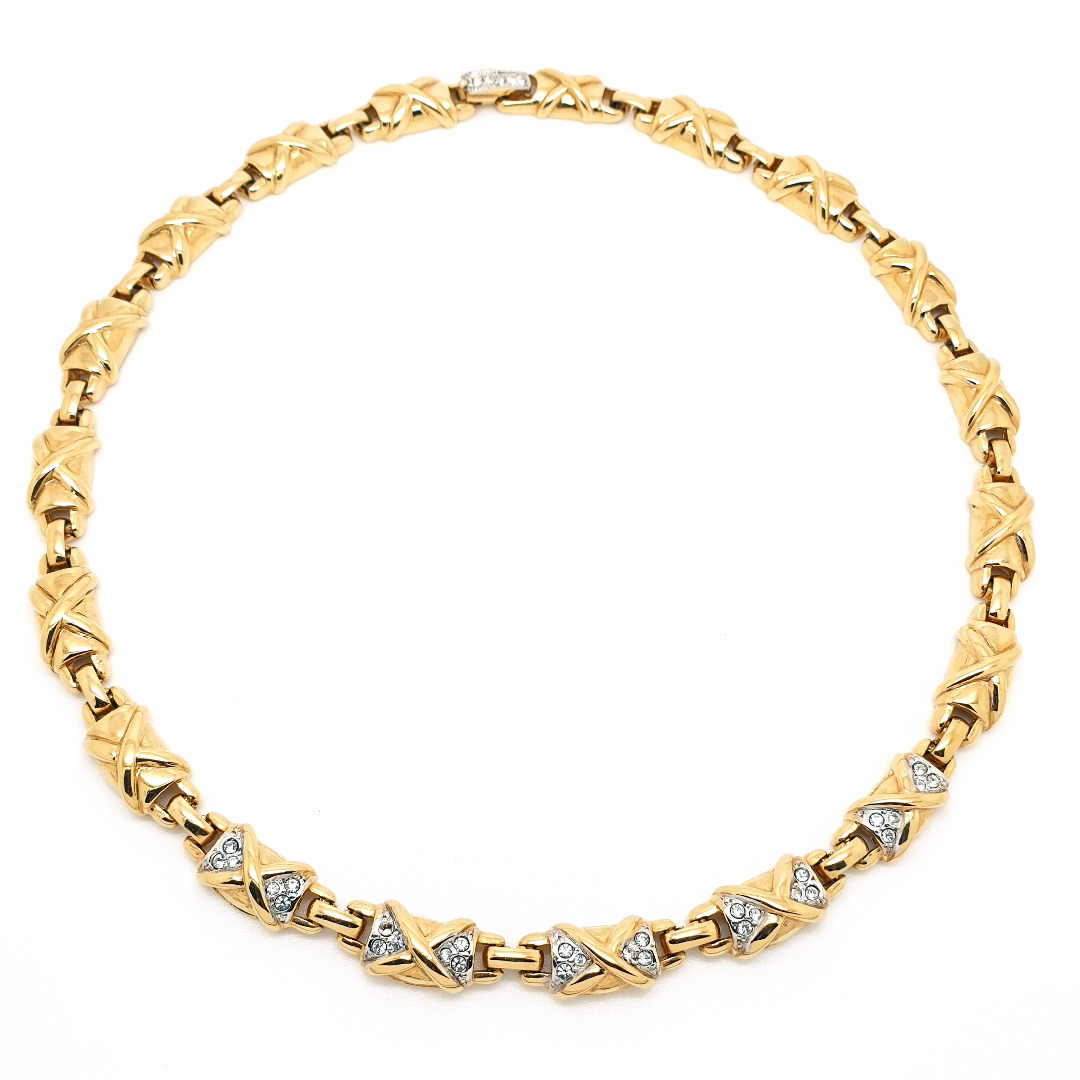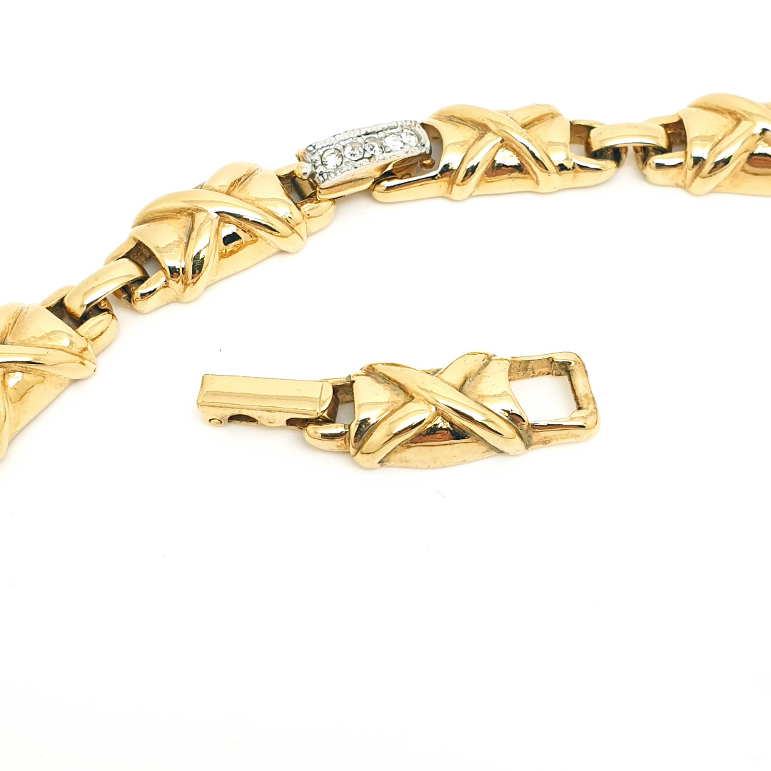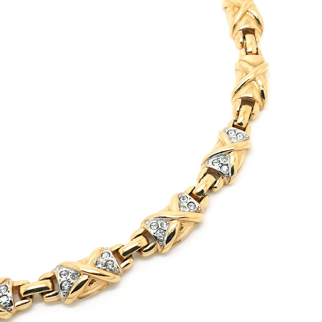 A stylish goldtone, possibly goldplated, short link necklace with clear rhinestones by Puccini, a Canadian Company that has existed from 1971. The necklace has a fold over clasp covered in rhinestones and an extension piece with fold over clasp as well. The necklace is in very good vintage condition.
