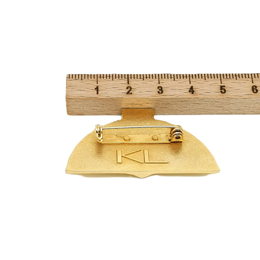 A tiny iconic shiny goldtone fan shaped brooch by Karl Lagerfeld. In very good vintage condition.