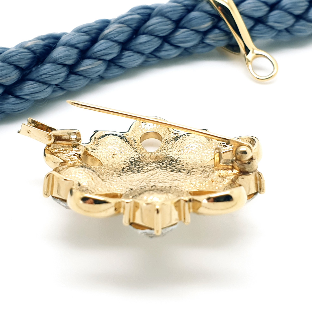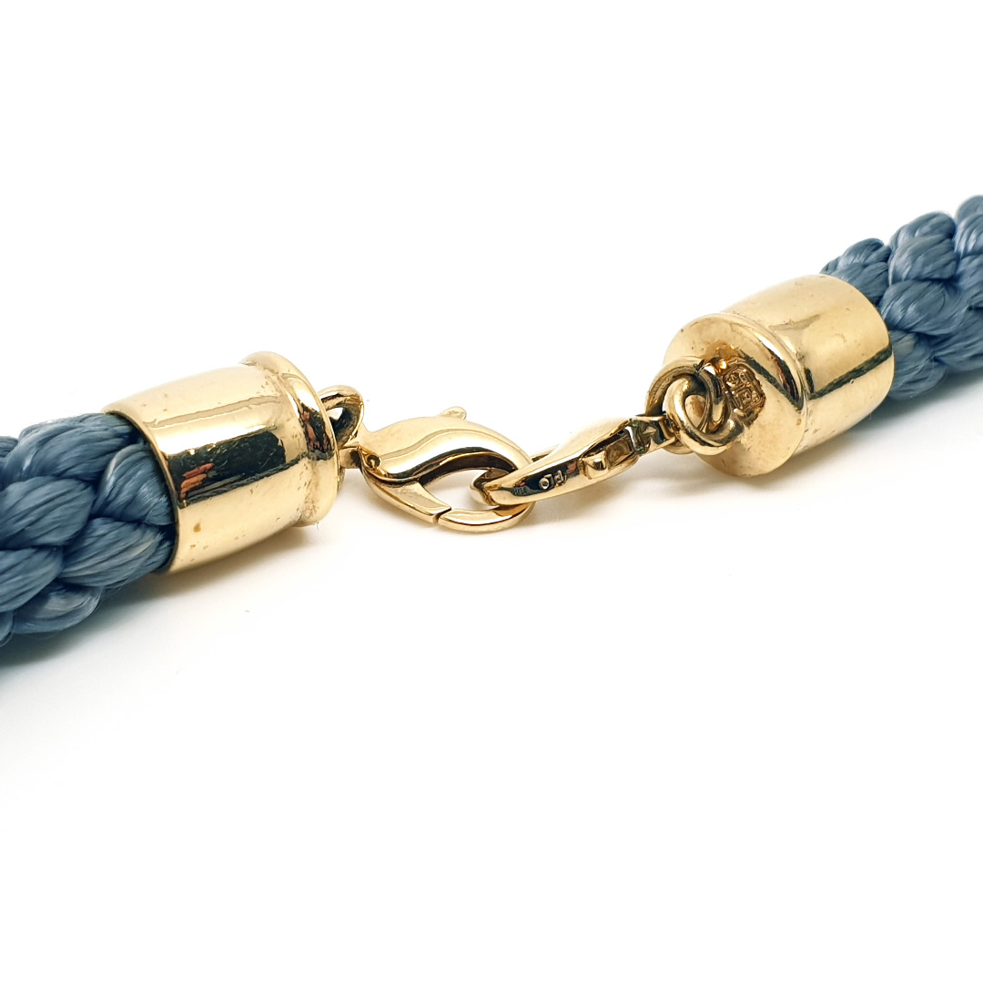 Chique, grijze koordketting van Pierre Lang met een prachtige hanger die ook kan worden gedragen als broche. Deze korte ketting heeft een goudkleurige hanger met strass en een 'faux' parel en kan op eenvoudige manier van de ketting worden verwijderd zodat je hem als broche kunt dragen. Zowel de hanger/broche als de twee sluitinkjes en de eindstukken van de ketting zijn gemerkt PL.