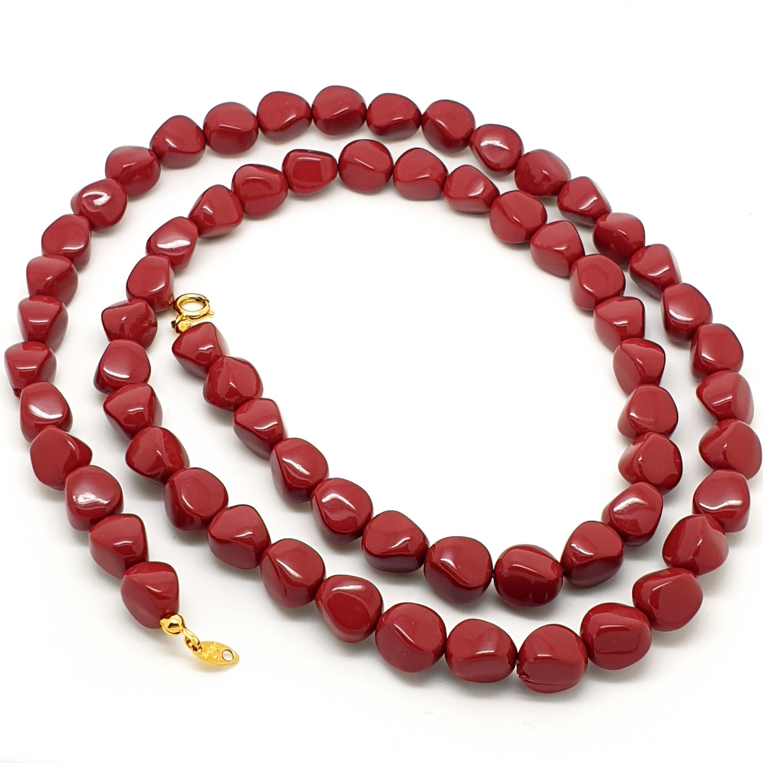 Lange ketting van Trifari met steenrode of wijnrode onregelmatig gevormde plastic kralen.