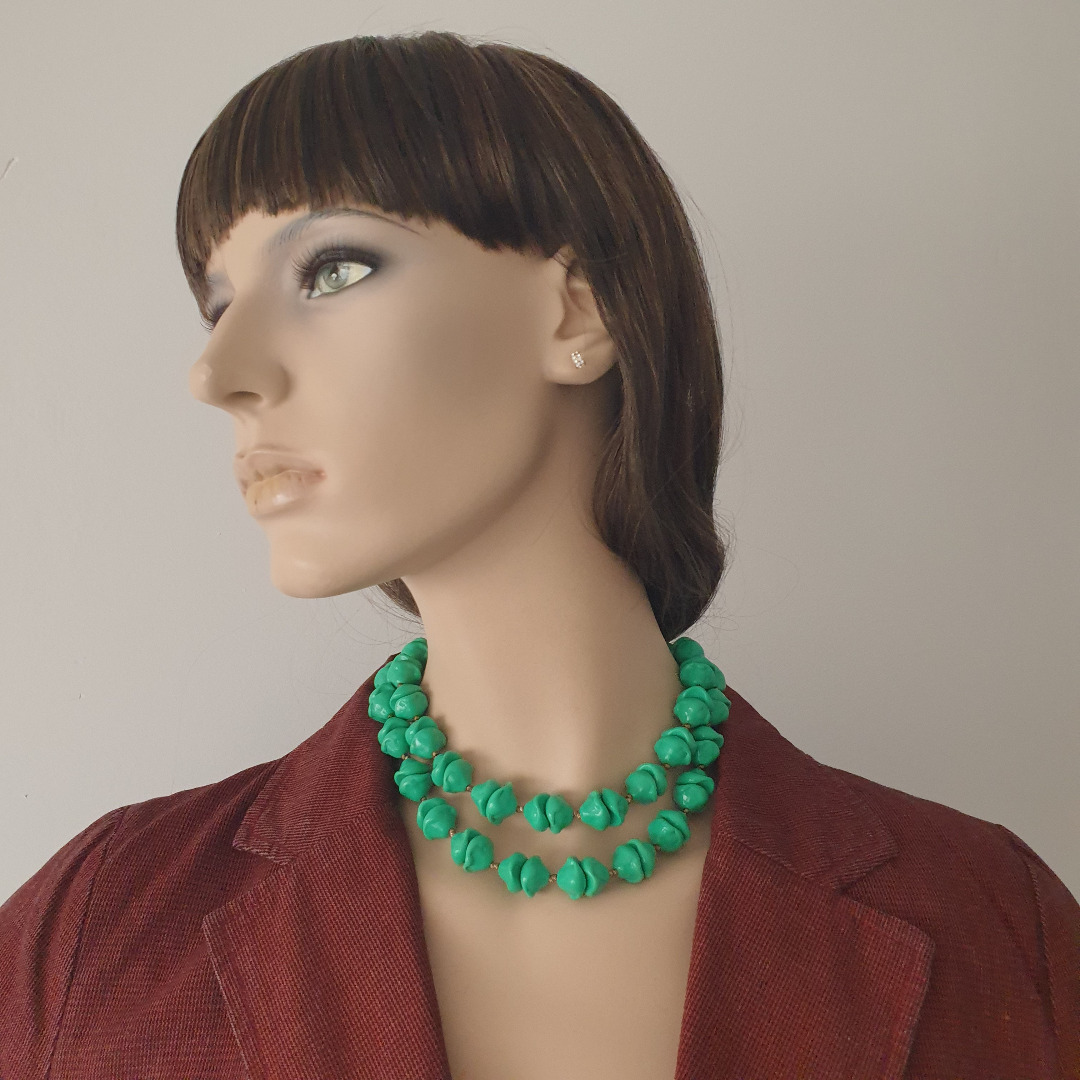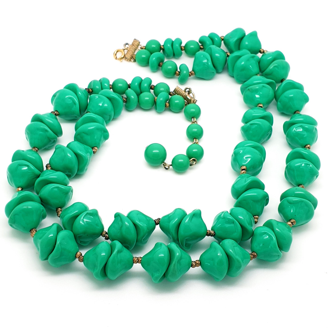 Short two row necklace with 'sets' of irregular shaped plastic beads in a wonderful green colour. In very good vintage condition.